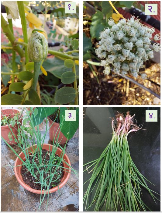 १.कांद्याची फुलं कोषातून बाहेर येताना; २.बिया धरलेली कांद्याची फुलं; ३.कांद्याची रोपं; ४.तयार कांदेपात